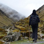 Eind van de middag vinden we een bureautje waar zich ook twee Brazilianen ingeschreven zouden hebben voor de trekking. Zouden, want Charlotte gelooft het niet zo. En ja hoor, de volgende ochtend als we om half negen downtown paraat staan hebben de Brazilianen net vijf minuutjes eerder ‘afgebeld’. Het meisje zou met een voedselvergiftiging in het ziekenhuis liggen. Yeah right. Nu zijn we dus toch met z’n tweeën plus onze Spaanssprekende gids die zich voorstelt als Frans. We pakken een taxi naar het begin van de trekking op bijna vijf kilometer hoogte, vanwaar je mooi uitzicht zou moeten hebben op de omliggende bergen. Onderweg doet onze Frans – die al duidelijk heeft laten merken dat hij liever in zijn bed was blijven liggen – nog wat inkopen voor de komende dagen. Als we bijna op het vertrekpunt zijn begint het te sneeuwen en eenmaal bovenop de berg zien we geen hand voor ogen meer. Ja, we wilden graag sneeuw zien, maar dan als een mooi poederlaagje op de bergkammen! Wat Charlotte betreft is dit het begin en ook meteen het einde, want we gaan hier natuurlijk niet doorheen lopen, toch?! Dankzij Dicks overtuigingskracht beginnen we toch aan de afdaling. Want dat is wat we de komende drie dagen voor 95% van de tijd gaan doen: afdalen, en wel van Cumbre naar El Chairo en van 4980 naar 1300 meter.