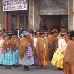 Aan de andere kant van de slagboom is het landschap om ons heen nog weinig anders dan in Chili, maar wat wel opvalt is dat we op de altiplano’s die in Chili maar zeer dunbevolkt zijn hier om de haverklap huisjes zien. Nouja, huisjes… Het zijn meer hutjes, gemaakt van grote blokken van – wat er uitziet als – uitgeharde modder. Direct zien we ‘Cholitas’, vrouwen van de hooglanden met hun lange vlechten die aan de onderkant bij elkaar worden gehouden door zwarte kwastjes, hun wijde gekleurde rokken en de typische bolhoedjes (voor wie het zich afvraagt: ja, die staan gewoon los op hun hoofd!). Vrouwen die onder een parasolletje hun haakwerkje zitten te doen terwijl ze de schapen hoeden, de gladiolen die ze hebben geplukt op een grote stapel naast zich; kindjes met vieze gezichtjes en indringende ogen die zich verschuilen onder moeders rokken of juist brutaal om geld komen vragen; mannen die met een door de zon gelooide huid op een piepknarsfietsje voorbij wiebelen en een jong ezeltje in de wei, zo groot als hobbelpaard. Ja, we zijn echt in een andere wereld aanbeland!