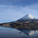 Putre is voor ons niet meer dan een tussenstation op onze eigenlijke bestemming: Parque Nacional Lauca. Bij gebrek aan campings overnachten we op een wildkampeerplek aan de rand van het dorpje. De overnachting op 3900 meter hoogte stelt ons in staat om een beetje te acclimatiseren, wat wel nodig is na weer een week op zeeniveau. Na een super koude nacht kachelen we aan het einde van de volgende ochtend op ons gemak naar Lauca. Het is nog maar 54 kilometer en een schitterend tochtje langs de Parinacota vulkaan. Als we arriveren op de ‘camping’ (faciliteiten bestaande uit een picknicktafel en een wc, door te spoelen met een emmer bergwater) gaan we snel op pad en maken we een mooi wandelingetje langs het Chungará meer waar we ook een paar flamingo’s zien.